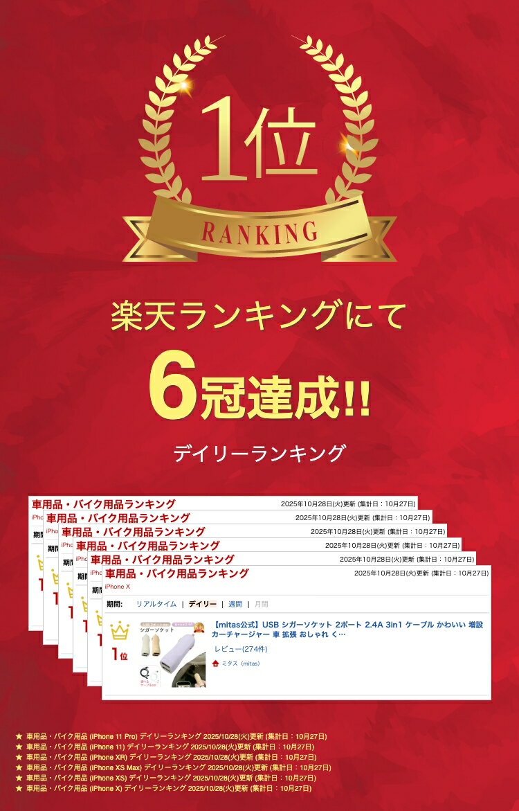 【mitas公式】USB シガーソケット 2ポート 2.4A 3in1 ケーブル かわいい 増設 カーチャージャー 車 拡張 おしゃれ くすみカラー スマホ ゲーム機 スマートフォン USBポート 小型 充電 充電器 USB充電 iPhone android タブレット 二股 分配 電源 HW-24CHR